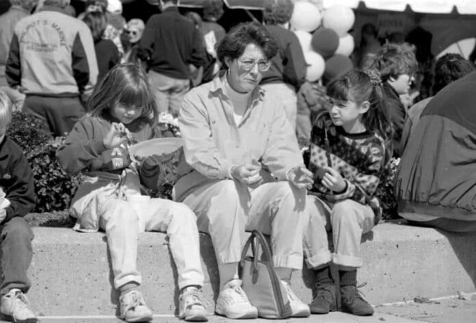 From left, Kristen Hudecek, Joni Quinn and Christine Quinn found a spot on the curb to sample food at Ethnic Expo in 1995. From The Republic archives