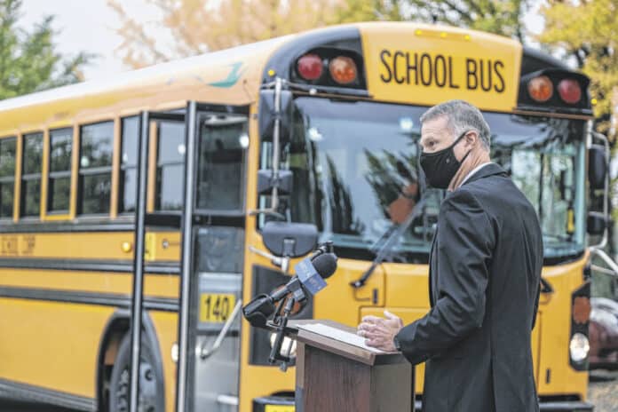 When the vehicle pulled up in front of the elementary school for Tuesday’s media event, there was hardly a sound except for a gentle hum from the bus and the soft splash of its tires gliding through puddles.