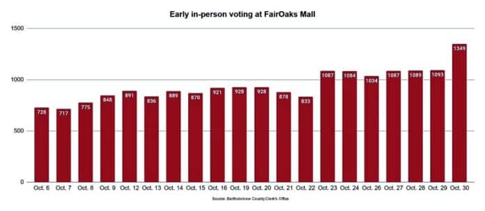 Overall, a total of 18,848 people have voted at FairOaks Mall since early in-person voting started on Oct. 6. Additionally, 6,543 absentee-by-mail ballots have been cast, raising the total turnout to 25,391, or 48% of registered voters.