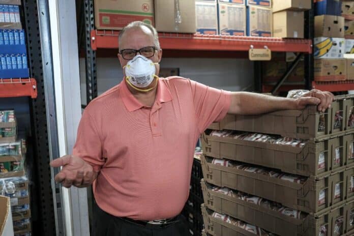 Love Chapel Ministries Executive Director Kelly Daugherty wears a mask as he talks about the increase in demand at the Love Chapel Food Pantry during the COVID-19 pandemic in Columbus, Ind., Tuesday, April 7, 2020. Food pantries in the area have seen an increase in demand due to job loss and businesses closing during the COVID-19 pandemic. Volunteers picked our groceries for those seeking assistance at Love Chapel to comply with social distancing guidelines to stop the spread of COVID-19. Mike Wolanin | The Republic