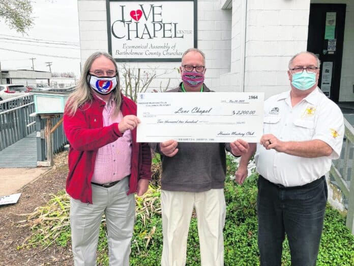 The Hoosier Mustang Club recently donated $2,200 from the proceeds of its annual fall festival car show to Love Chapel. Standing with the check are, from left, club president Jerry Mihay, Love Chapel Executive Director Kelly Daugherty, and club treasurer Frank Bayles.