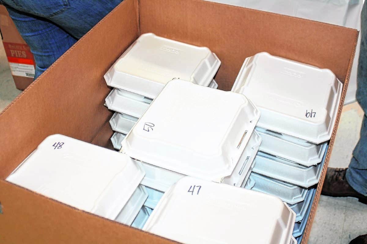 To-go meals are stacked in a box just before deliveries Thursday for Columbus Baptist Church's Feed the Flock Thanksgiving outreach.