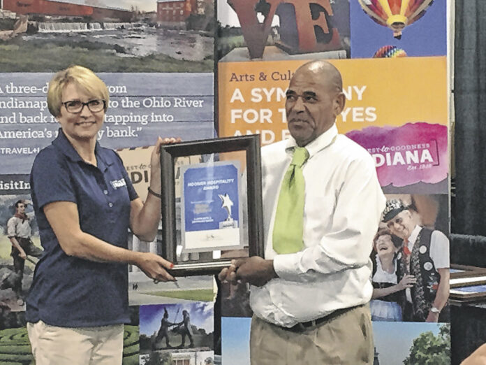 Lt. Gov. Sue Ellspermann, left, presents Melton Lightfoot of Bartholomew County with a 2015 Hoosier Hospitality Award on Aug. 21, 2015 at the Indiana State Fair. Republic file photo