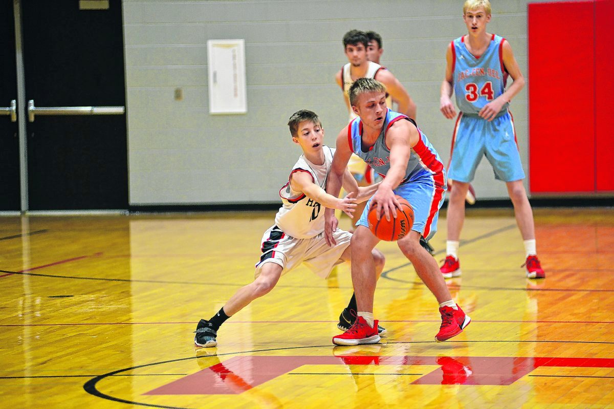 Hauser's Alex Bower looks to steal the ball from Jac-Cen-Del's Damon Hughes during a game in the Holiday Classic at Edinburgh High School. Tommy Walker | For The Republic