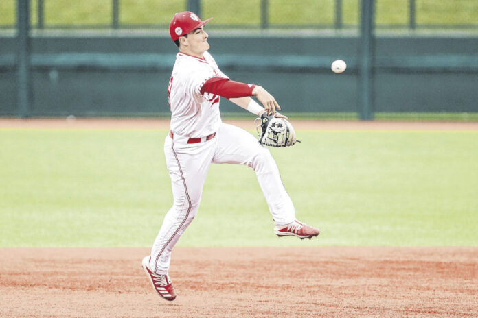 Columbus North graduate and Indiana University junior Cooper Trinkle throws to first base against Purdue at Bart Kaufman Field in Bloomington. Photo By Andrew Mascharka/Indiana Athletics