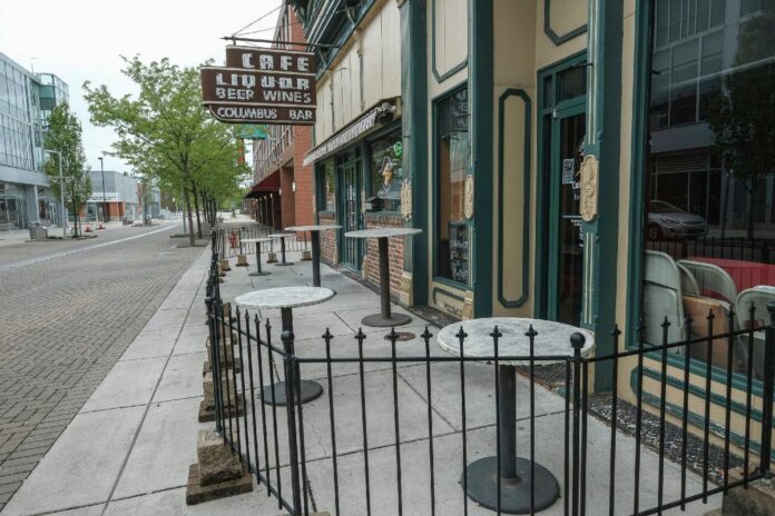 A view of the outdoor seating area at Columbus Bar in downtown Columbus, Ind., pictured Wednesday, April 29, 2020. Mike Wolanin | The Republic