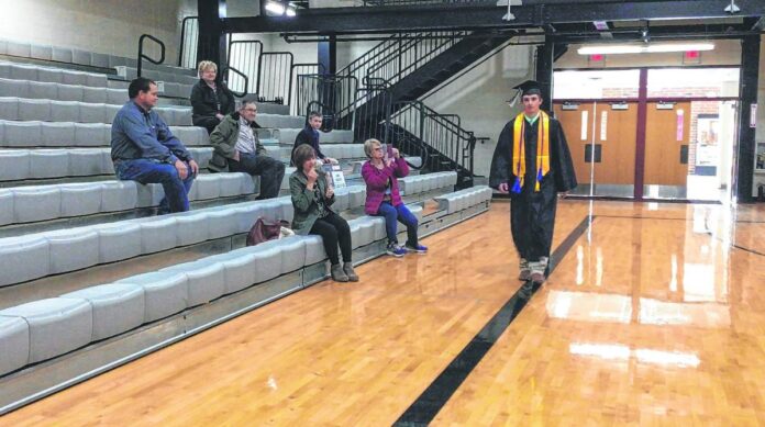 Hauser graduate Luke Harker takes a graduation walk while family members watch during Hauser Jr.-Sr. High School's virtual commencement ceremony, which debuted Thursday on the school's YouTube channel. Submitted photo