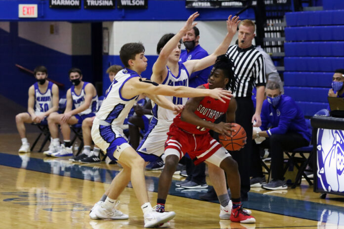 Columbus North's Max Wilson and Jakub Trusina guard Southport's Keyon Miller at Columbus North, Friday, Jan. 29, 2021. Paige Grider for The Republic