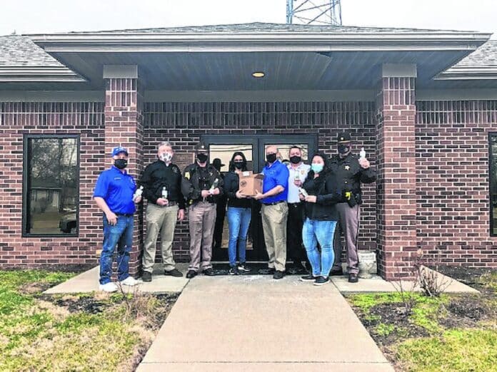 Bartholomew County Emergency Management recently received a donation of 15 cases of hand sanitizer from the St. John’s Masonic Lodge. Members Dirk Rader, Rocky Myers, and Matt Akers presented the sanitizer to local emergency officials, including director Shannan Cooke, deputy director Natalie Ferrenburg, Sheriff Matt Myers and Maj. Chris Lane, and Dave Thompson of the Columbus Township Fire & Rescue.