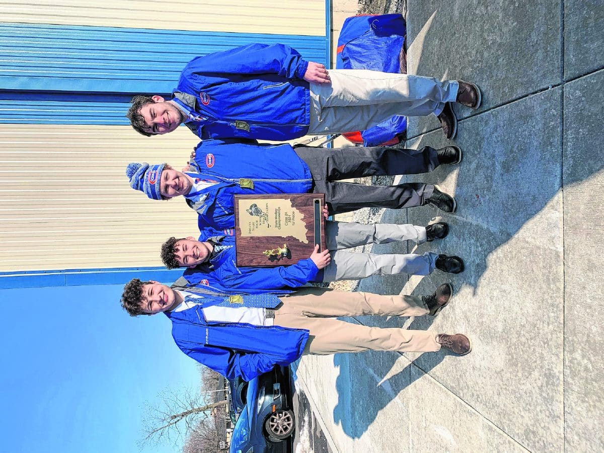 Columbus Icemen captains, from left, Joe Neal, Evan Federle, Brayson Bennett and Andrew Clark hold the championship trophy after they beat Central Indiana Knights for the Class 2A state hockey title Saturday in Hammond. Submitted photo
