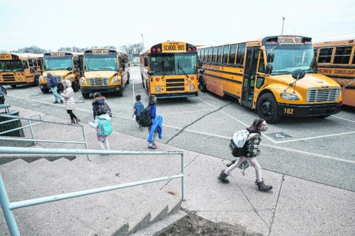 Southside Elementary students head to their busses at the end of the school day in Columbus, Ind., Thursday, Jan. 7, 2021. Southside teacher Mark Yeaton is pulling double duty as a teacher and bus driver due to BCSC bus driver shoratges. Yeaton completed his first solo bus route on Jan. 5, but is still learning the ins and outs of his route. He occasionally has to ask to students on his bus to warn him if he's going to miss a bus stop. Mike Wolanin | The Republic