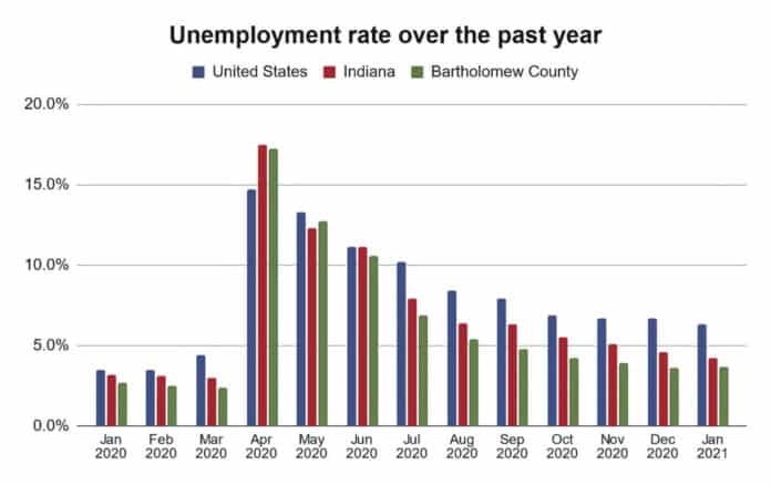In January, Bartholomew County’s unemployment rate was 3.7%, up slightly from 3.6% in December and higher than in January 2020, when unemployment stood at 2.7%, state records show.