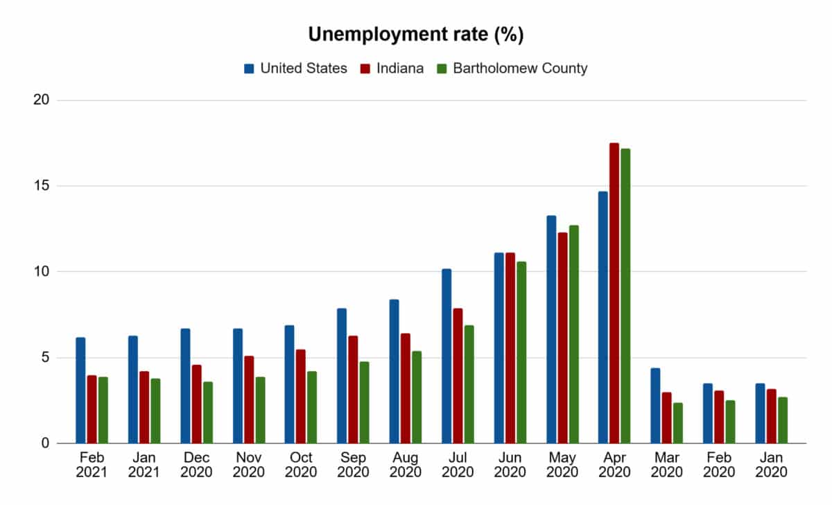 In February, Bartholomew County’s unemployment rate was 3.9%, up slightly from a revised 3.8% in January and 3.6% in December, state records show. In February 2020, unemployment stood at 2.5%.