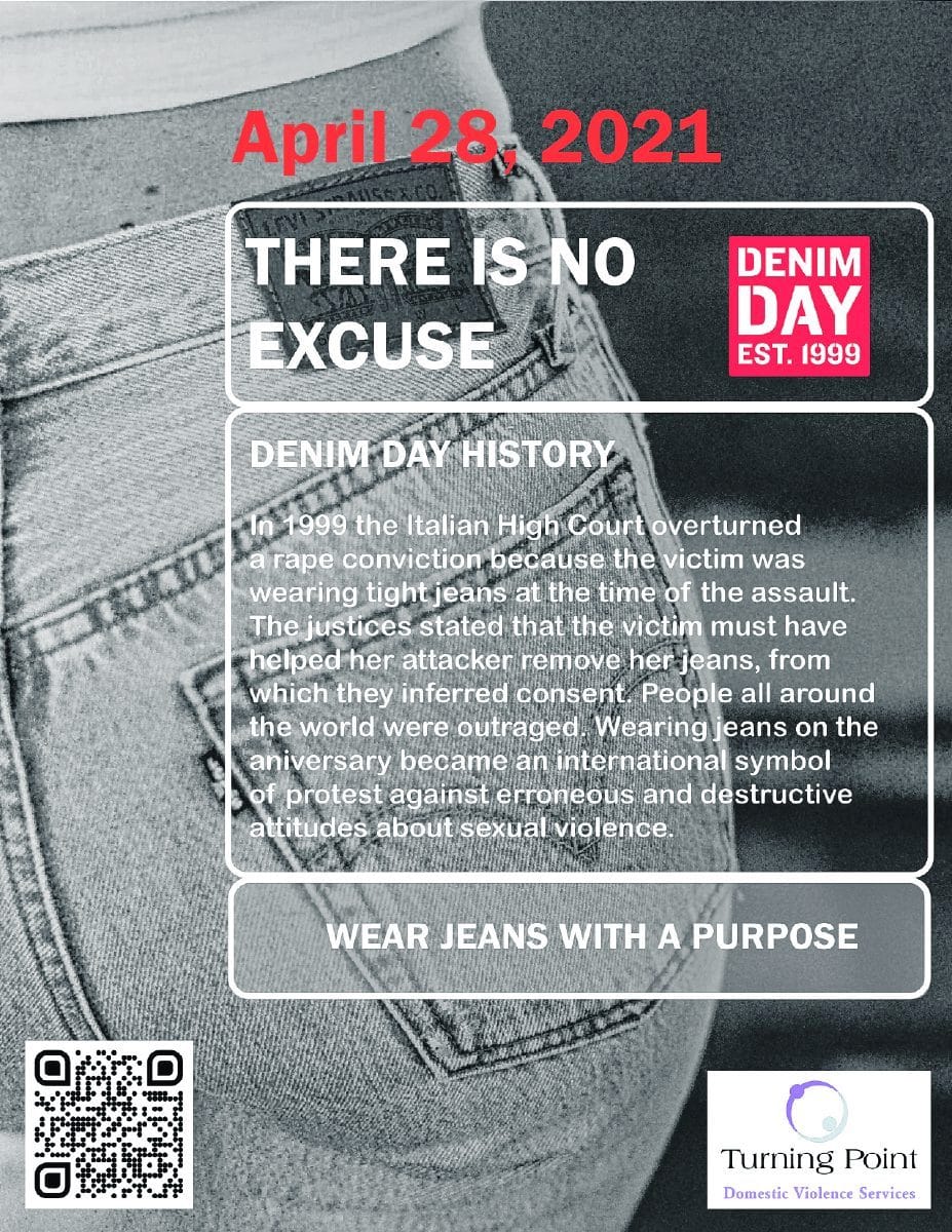 Turning Point will respond with additional information and opportunities to receive materials for this year’s Denim Day. The organization is asking participants on April 28 to share photos of you, your co-workers or your family wearing denim and post them to Turning Point’s Facebook or Instagram accounts.