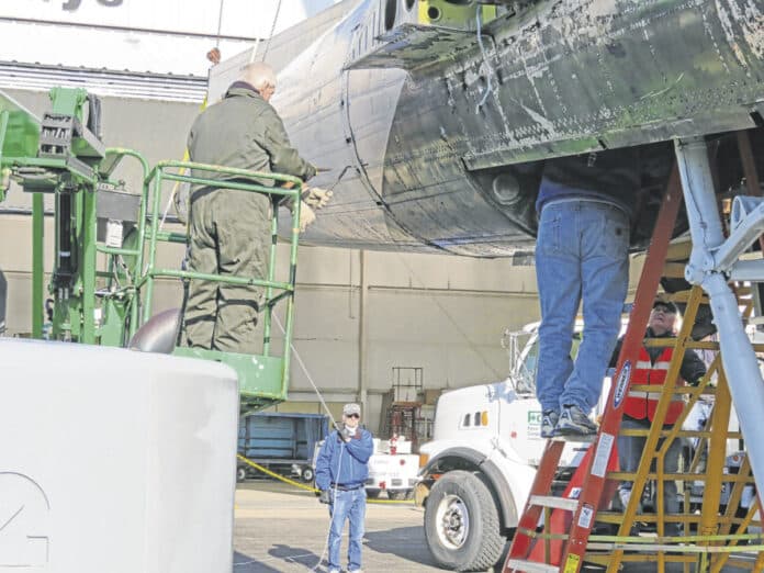 The 40,000-pound plane, which is not airworthy, was taken apart last year at an airport in Greybull, Wyoming, where the aircraft’s parts were loaded onto trucks and driven 1,460 miles to the Columbus Municipal Airport. The final pieces of the aircraft arrived in July.