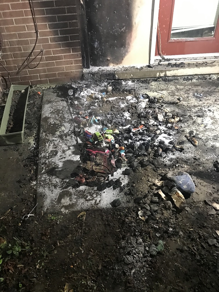 When firefighters arrived on the scene they reported that the fire was out. Firefighters found a melted plastic trash toter on the rear entrance of the apartment and charring and discoloration to the building’s exterior. The fire damage was confined to the exterior of the apartment.