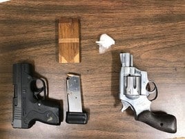 Trooper Boley located a revolver with the serial number removed and a loaded 9mm semi-automatic pistol during a search of the vehicle. Approximately five grams of methamphetamine and one gram of marijuana were also found.