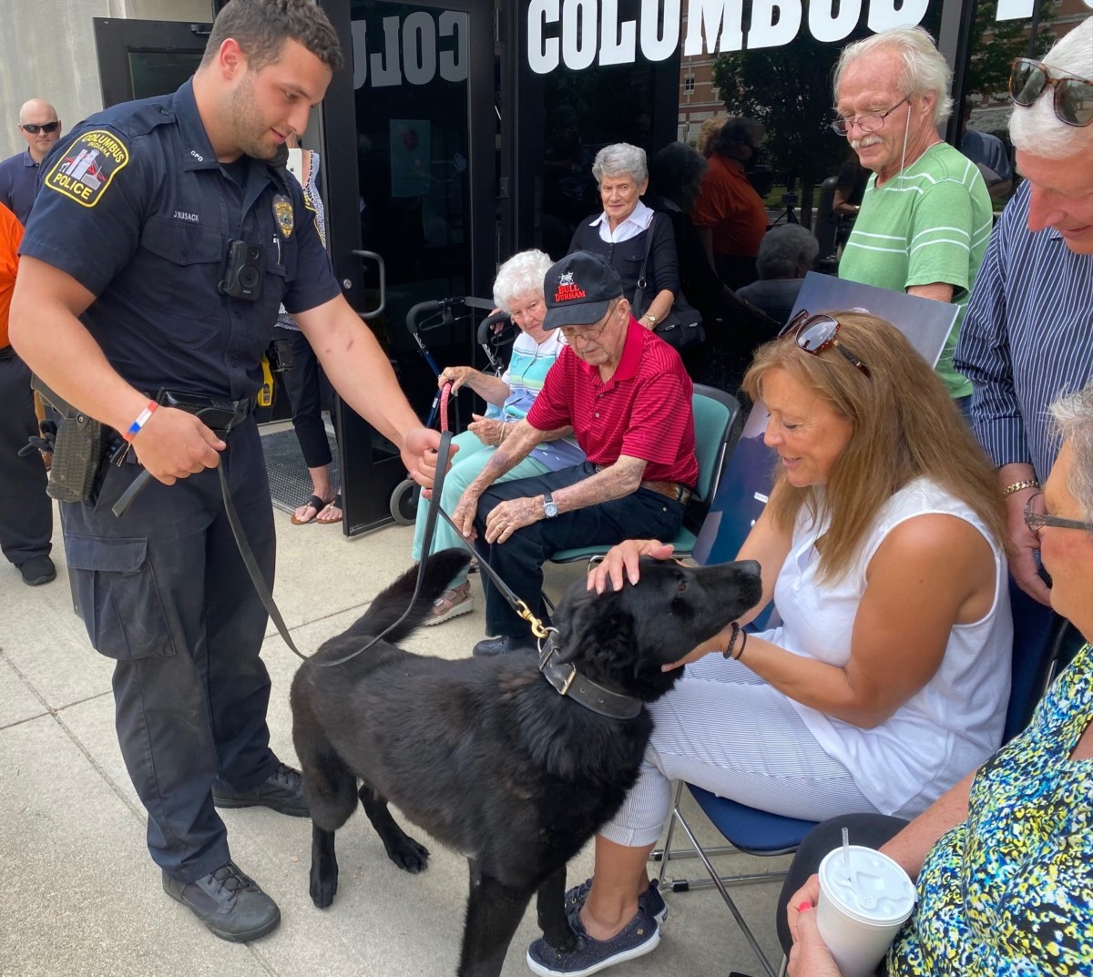 On Thursday, nearly three dozen people — including many members of Sweeney’s family – gathered to be introduced to K-9 Cleon, a black German Shepherd named in honor of the 36-year veteran officer who died in July 2015.