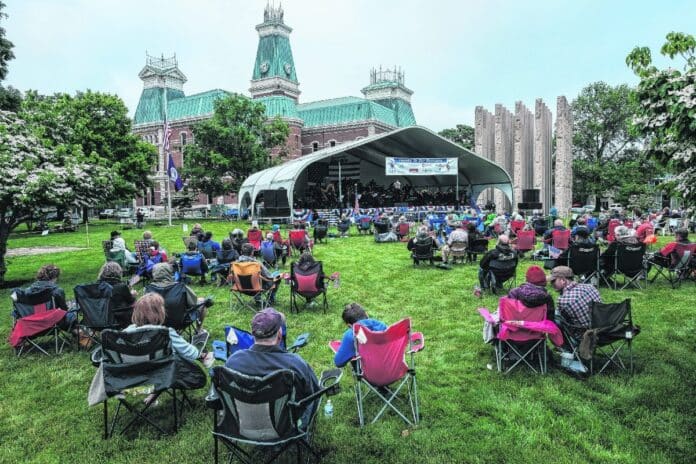 Patriotism stood front and center even before the event began as celebrated vocalist Marietta Simpson of Indiana University warmed up with a flag-waving version of “America the Beautiful.” As she sang, dogs on leashes frolicked in the grass while attendees staked out spots near the edge of Second Street.