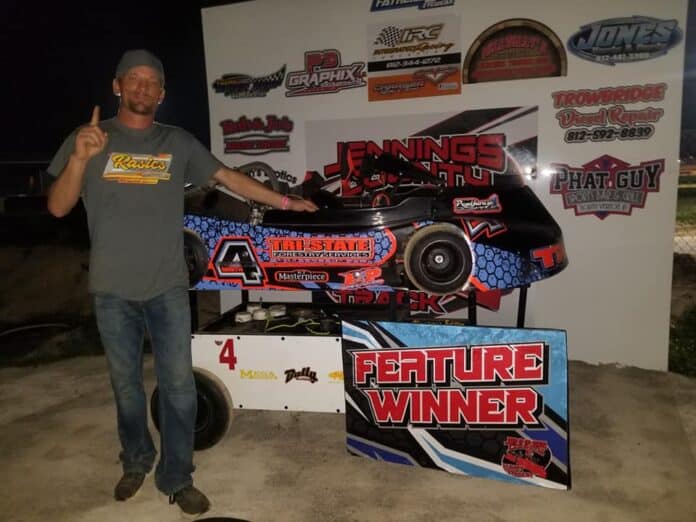 Josh Turner of Edinburgh won his second straight super stock feature. Other feature winners were Hunter Perry (hornets); Daniel Moore of North Vernon (pure stocks); Tripp Gerrald of Lexington, Kentucky (MMSA mini sprints); and Jeffery Cranmer of Memphis (crown vics).
