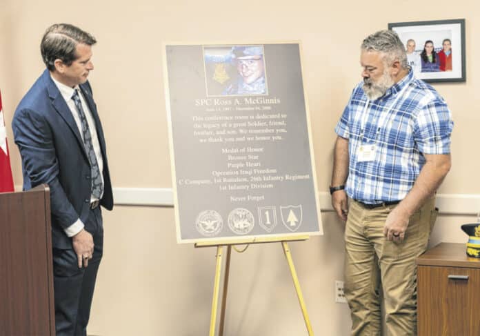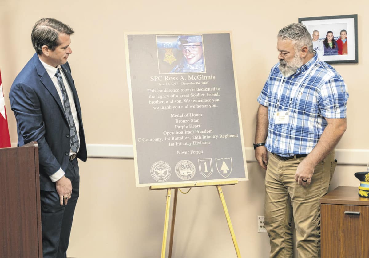 Veterans Travis Atwood and Kenneth Hendrix look at a plaque that will be hung in a conference room at Camp Atterbury for SPC Ross McGinnis, a Metal of Honor recipient who was killed in Iraq in 2006.