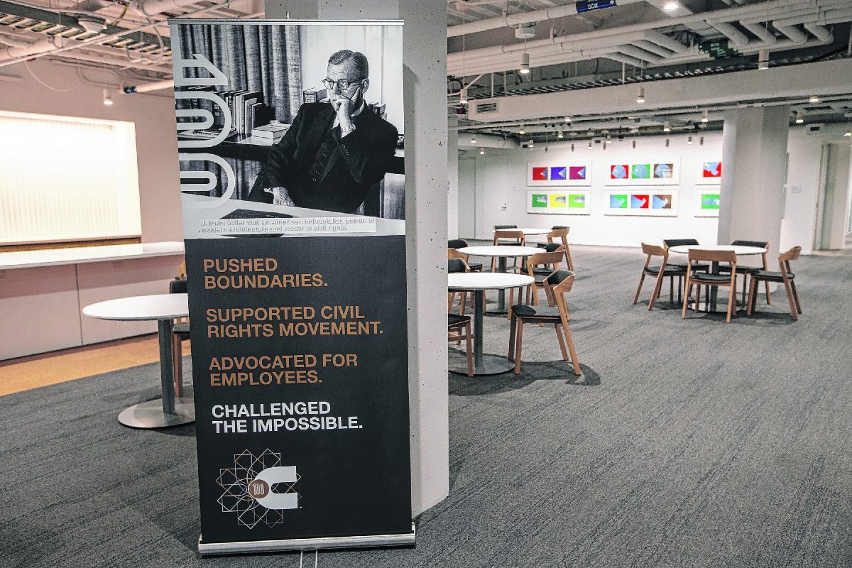 A banner of J. Irwin Miller, former chairman of Cummins, is visible in a gathering space in the basement of the newly remodeled Cummins Corporate Office building in Columbus, Ind., pictured Tuesday, July 23, 2019. Cummins is currently in the midst of a two stage renovation of their corporate headquarters in Columbus. Mike Wolanin | The Republic Mike Wolanin | The Republic