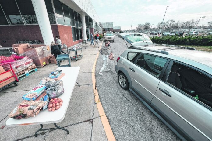 Volunteers help distribute food from the Columbus East Food Pantry at Columbus East High School in Columbus, Ind., Friday, Nov. 20, 2020. Mike Wolanin | The Republic
