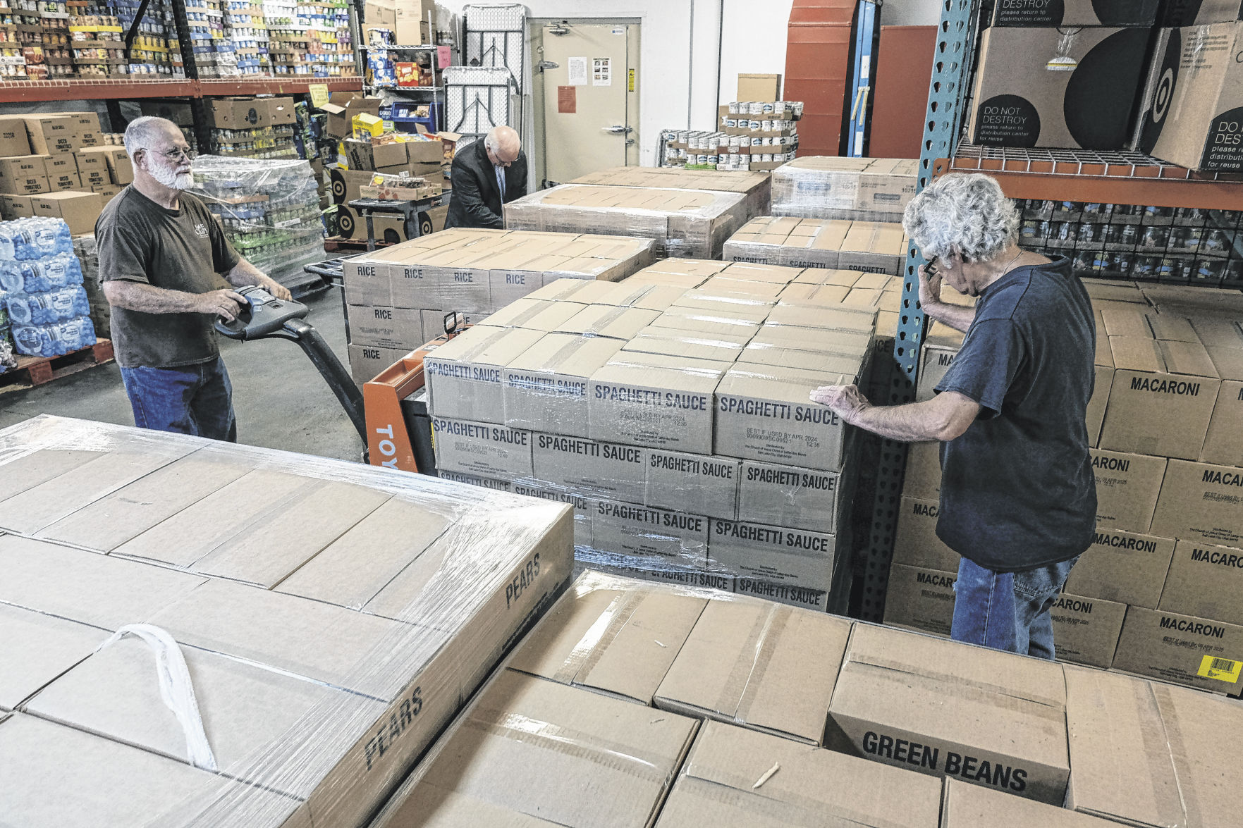 Harry Stephenson, left, and Pat Rafferty help organize a large food donation from the Church of Jesus Christ of Latter-day Saints at the Love Chapel food pantry in Columbus, Ind., Wednesday, July 14, 2021. Mike Wolanin | The Republic