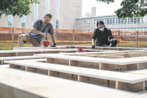 Dorian Bybe, left, and Brian Kim work on Jei Jeeya Kim’s Exhibit Columbus installation LaWoSo Ground on the lawn of First Christian Church in Columbus, Ind., Wednesday, July 21, 2021. Mike Wolanin | The Republic