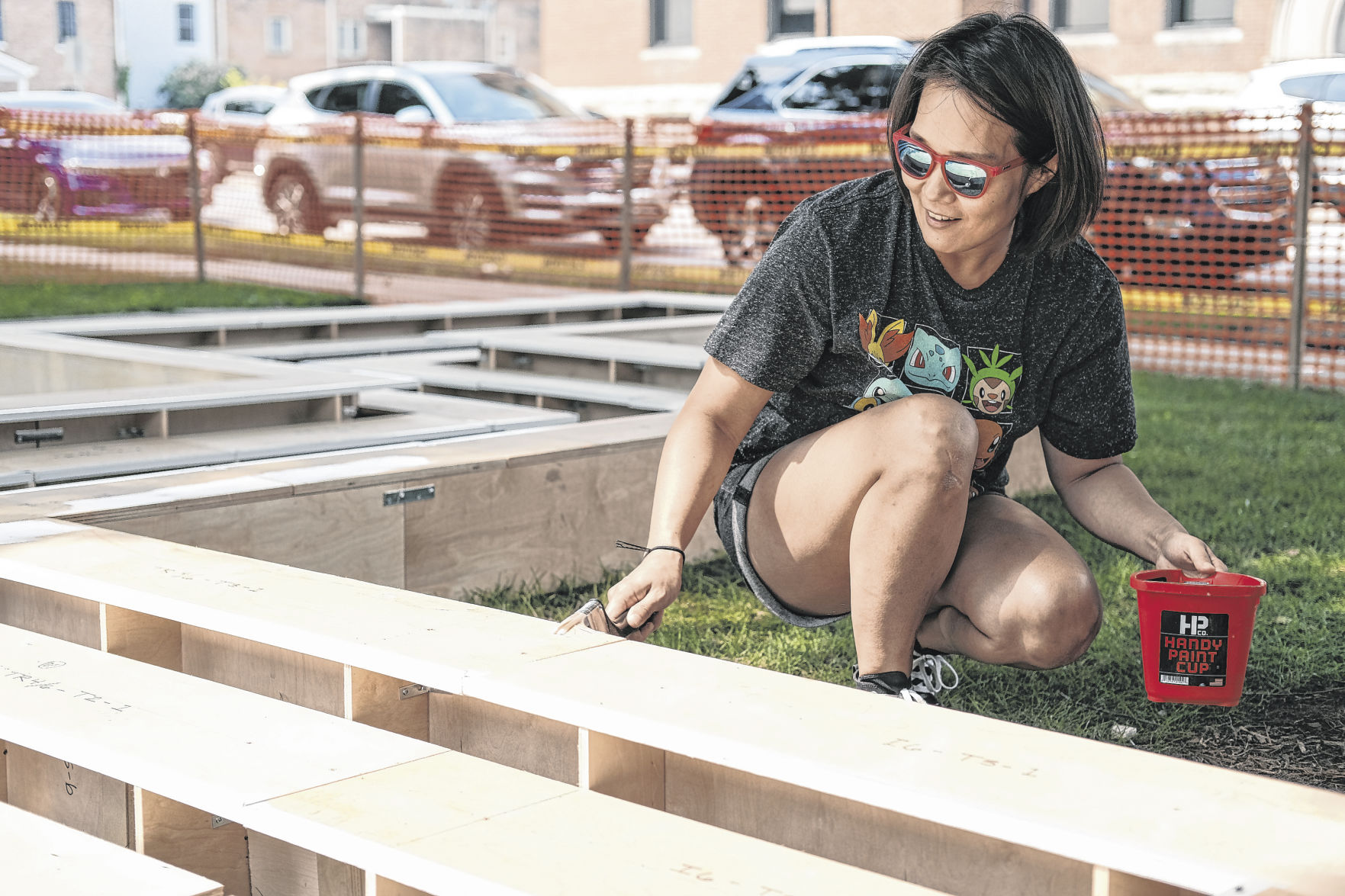 Jei Jeeya Kim, of Indiana University, works on her Exhibit Columbus installation LaWoSo Ground on the lawn of First Christian Church in Columbus, Ind., Wednesday, July 21, 2021. Mike Wolanin | The Republic