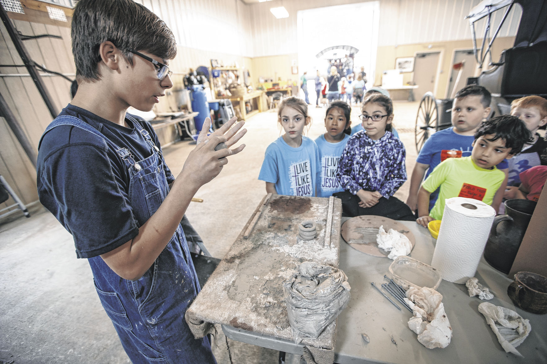 Cameron Toole teaches local elementary school students how to make pottery during a 2019 event at Henry Breeding Farm in Edinburgh.