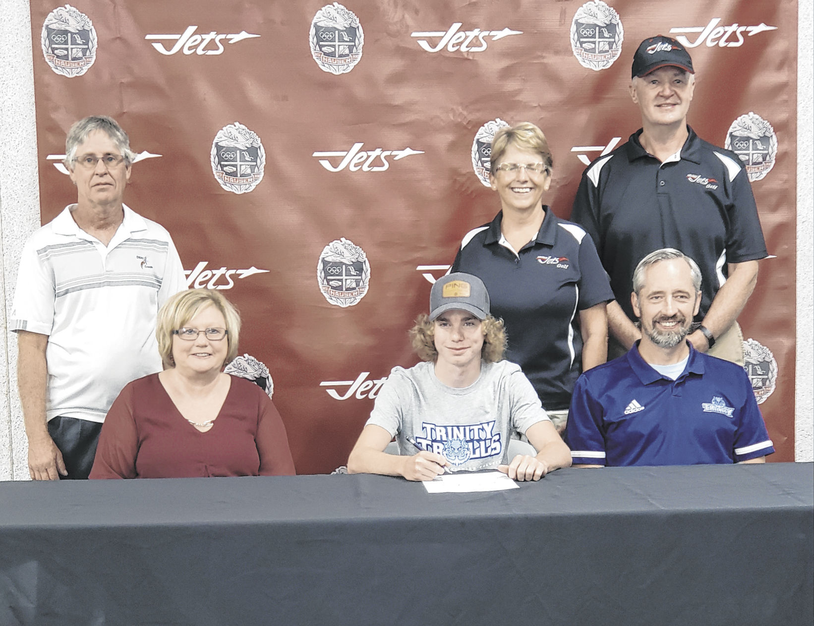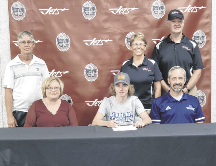 Recent Hauser graduate Justice Gilliland, front center, signed a letter-of-intent to play golf at Trinity Christian College. He is joined by his parents, Monte and Judy Gilliland, at left, along with Trinity Christian coach Jeremy Bialek, front right, and Hauser coaches Donita and Mike Compton, back right. Submitted photo