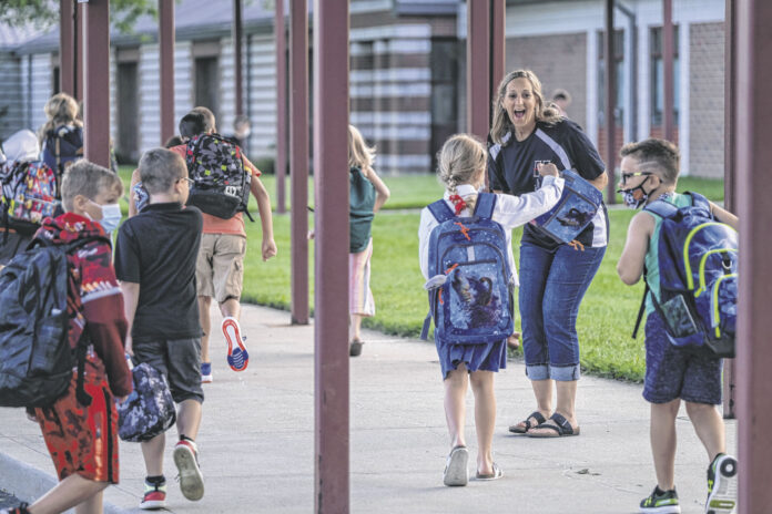 Lea Chipman, an IT specialist Hope Elementary and Hauser Jr.-Sr. School, greets students as they arrive on campus on the first day of school in Hope, Ind., Thursday, Aug. 5, 2021. Mike Wolanin | The Republic