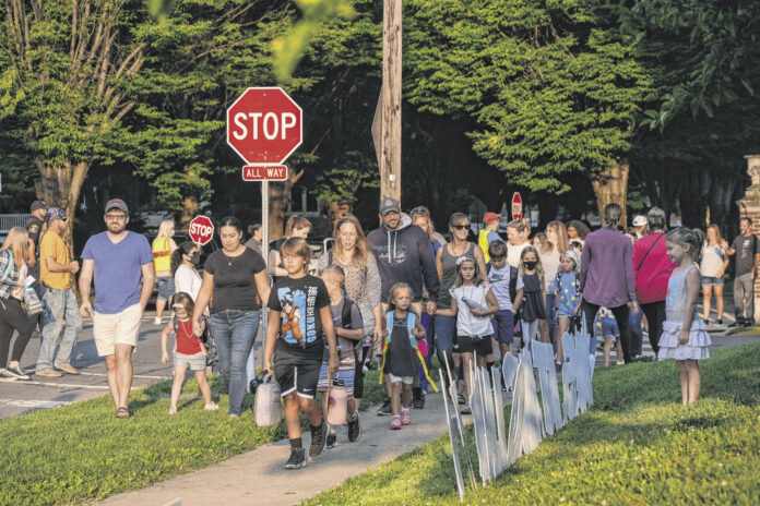 Of course, the first day got off to a bit of a less-than-normal start, given that a Chick-fil-a cow mascot was on hand at Lincoln, and there were also stand-ins of Marty McFly and Doc Brown for photo ops. Findley, who could be seen helping families take group photos, said that they try to make the first day “feel like a big party for the kids.”