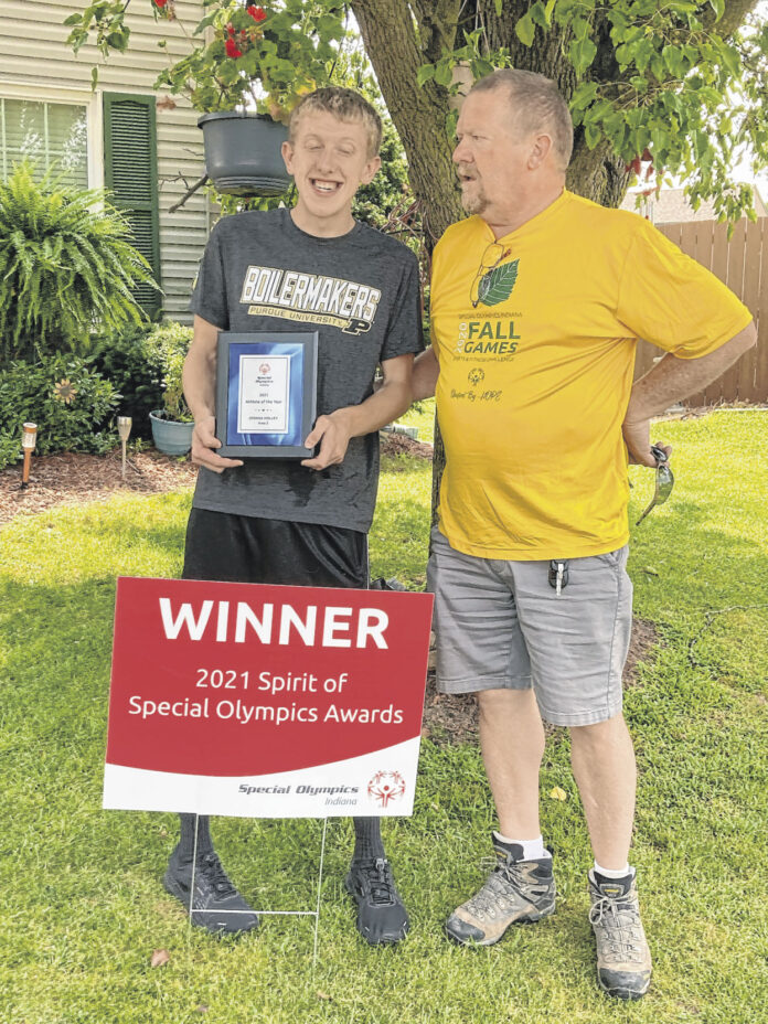 Special Olympics Indiana track and field coach Andy Hunnicutt, right, presents Josh Holley with the Special Olympics Athlete of the Year award for Area 2, which includes 15 counties in Southeast Indiana, on Wednesday at Holley’s house.