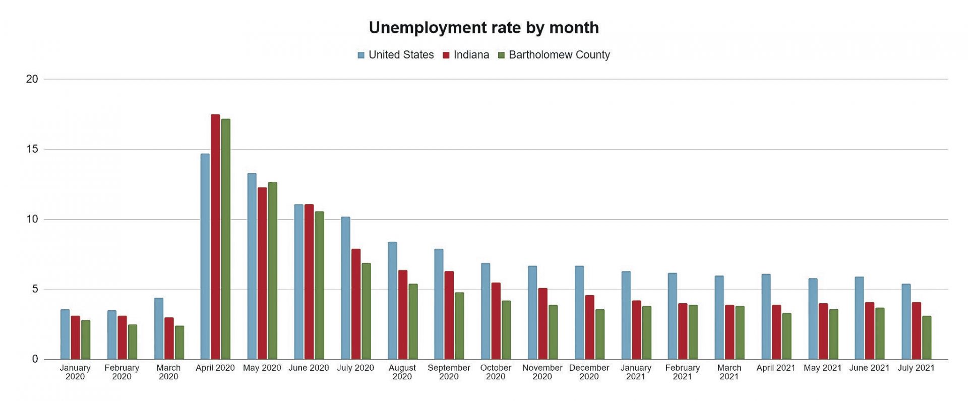 In July, Bartholomew County’s jobless rate was 3.1%, down from 3.7% the month before and the lowest since March 2020, when unemployment was 2.4%, according to figures released Monday by the Indiana Department of Workforce Development.