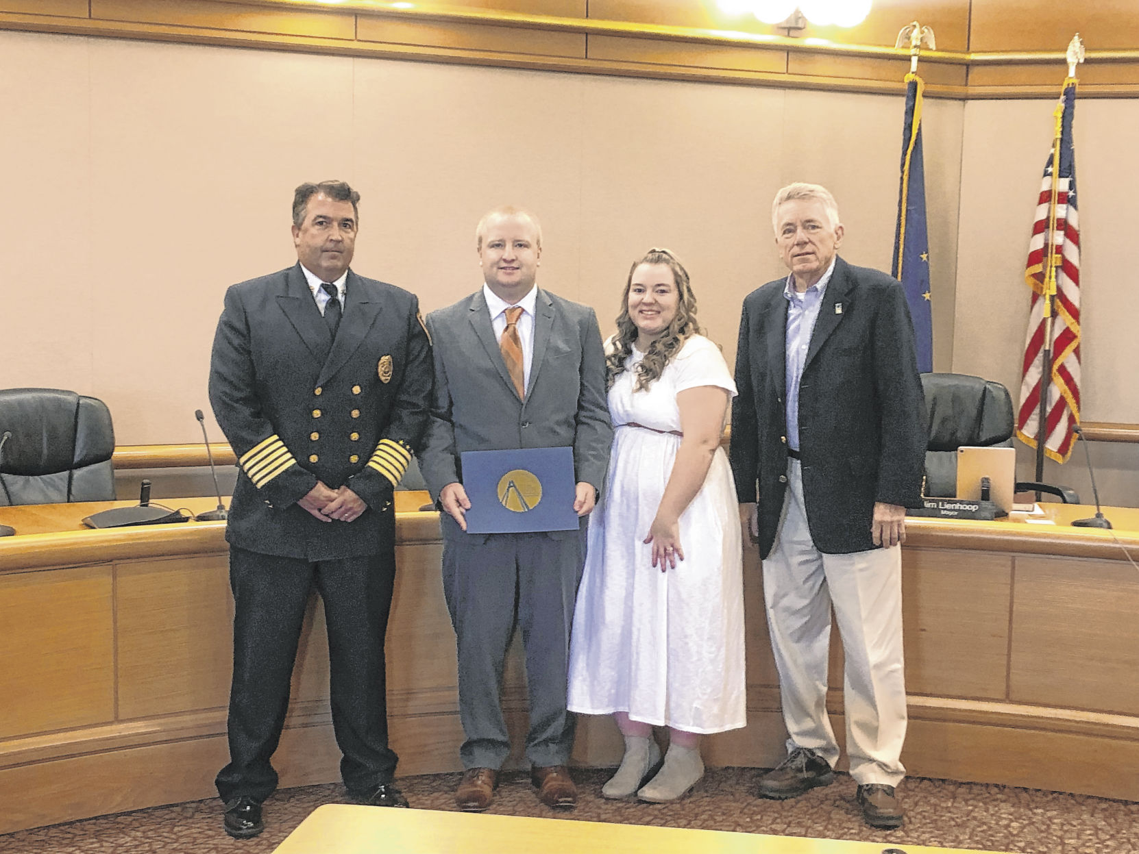 Taylorsville native Cody Melton, 25, was sworn in as Columbus’ newest firefighter by Mayor Jim Lienhoop at Tuesday’s Board of Public Works and Safety meeting.