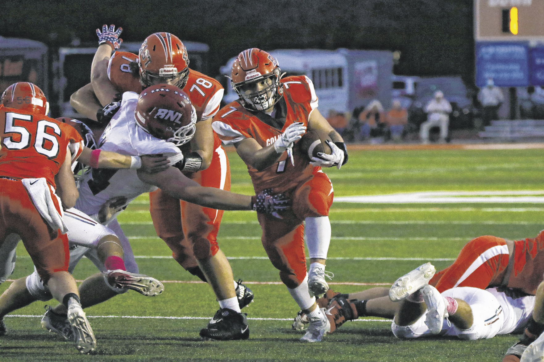Following the Stars’ quick strike by Zane Anderson, the Olympians (4-5, 4-2) had the ball for 16 plays on their first offensive possession, but after getting inside the BNL 10, a pair of penalties pushed it back, and Nathaniel Hedrick was wide left with a 40-yard field goal attempt.