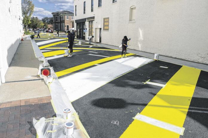 Volunteers apply white Tuff Coat to the road surface on Sixth Street for the Sixth Street Arts Alley in downtown Columbus, Ind., Saturday, Oct. 16, 2021. Mike Wolanin | The Republic