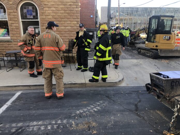 COLUMBUS, Ind. — Columbus firefighters evacuated a number of businesses and homes on the east side of the 500 block of Washington Street after a construction crew struck a natural gas line while excavating on a vacant lot between Washington and Jackson streets.