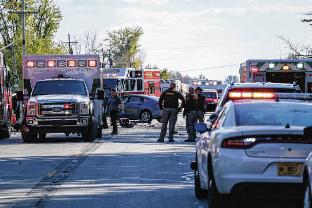 Emergency vehicles are parked on U.S. 31 in response to a multi-vehicle accident in Columbus, Ind., Thursday, Nov. 5, 2021. Mike Wolanin | The Republic