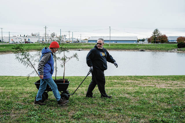 Aase Wilking, left, and Ryan Kikendall take a wheelbarrow of bald cypress trees to be planted around a retention pond near Columbus East High School in Columbus, Ind., Monday, Nov. 1, 2021. Columbus East senior Kade Kikendall organized a group of student and non-student volunteers to plant trees around the pond. The trees were planted as part of a bicentennial project to plant 200 trees in Bartholomew County. Mike Wolanin | The Republic
