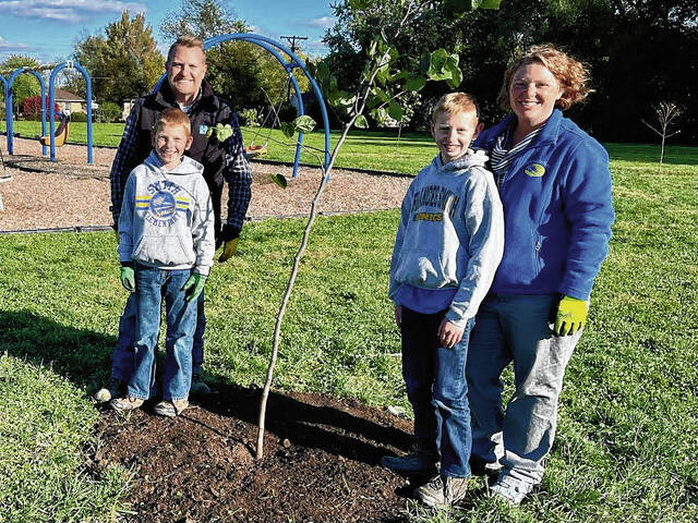 Brian Payne, Dawson Payne, Amber Payne and Colby Payne are shown with one of the new trees planted at Smith Elementary.