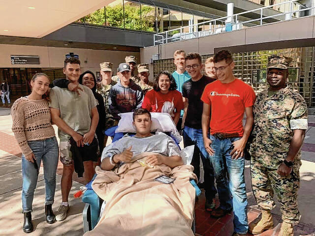 Columbus East graduate Aaron Cepeda is surrounded by friends and fellow Marines while recovering from a car accident at Camp Pendleton near San Diego.