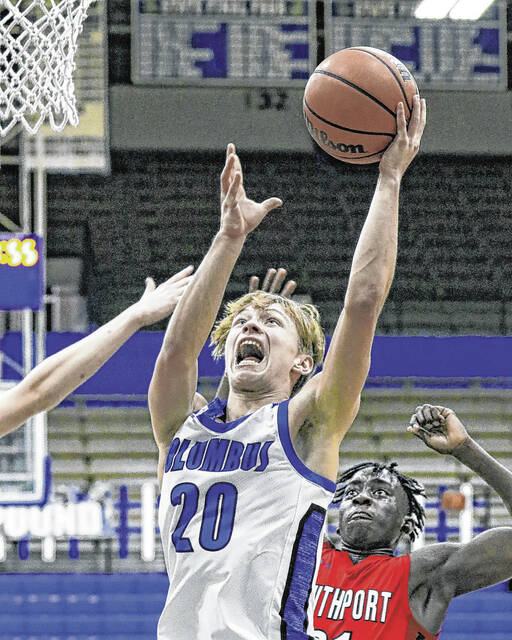Columbus North’s Cooper Horn shoots a layup against Southport at Columbus North, Friday, Jan. 29, 2021. Paige Grider for The Republic