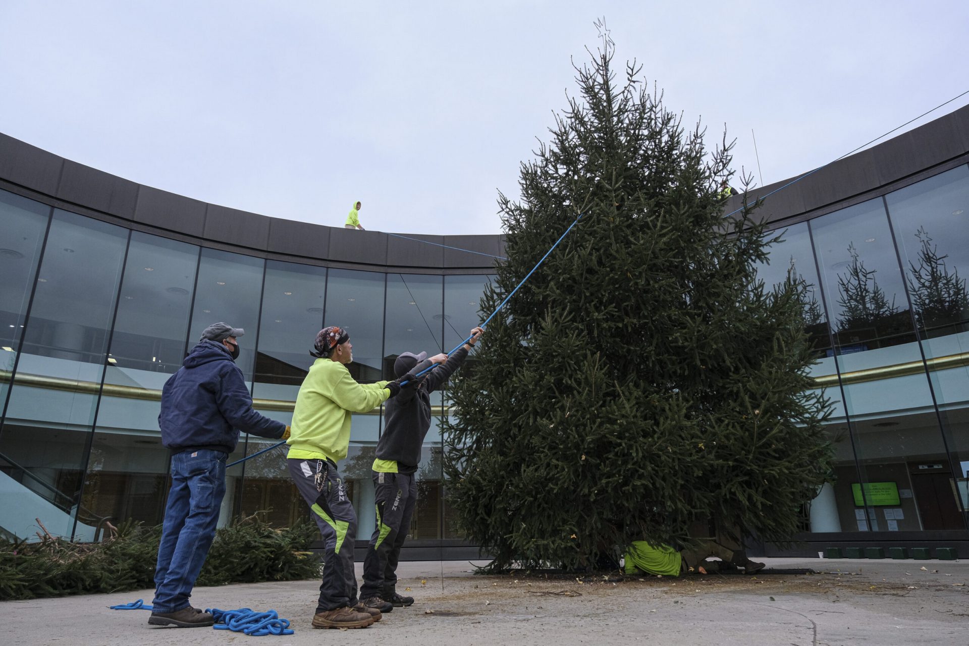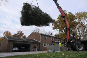 A Norway spruce tree is hoisted from Whitney and Patricio Amuchastegui’s back yard in Columbus, Ind., Wednesday, Nov. 17, 2021. The Amuchasteguis donated the tree to be the Christmas tree at Columbus City Hall.