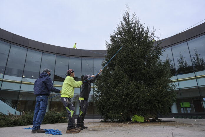 According to Burton, crews from Frank’s Tree Care cut the spruce down Wednesday morning. The Department of Public Works then transported it to city hall on a flatbed truck. From there, the tree was set up at the plaza by a combination of individuals from public works, parks and recreation and Frank’s.
