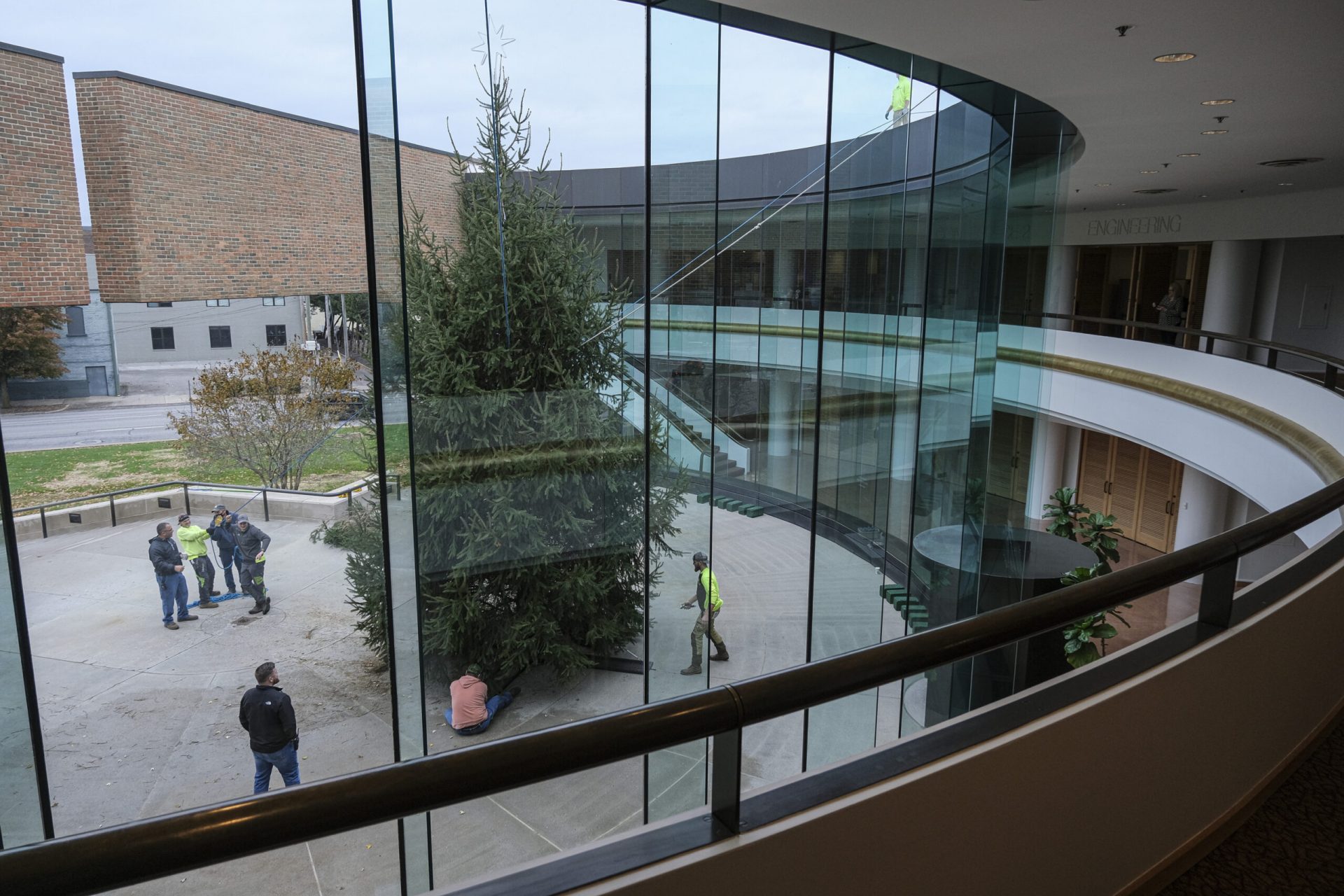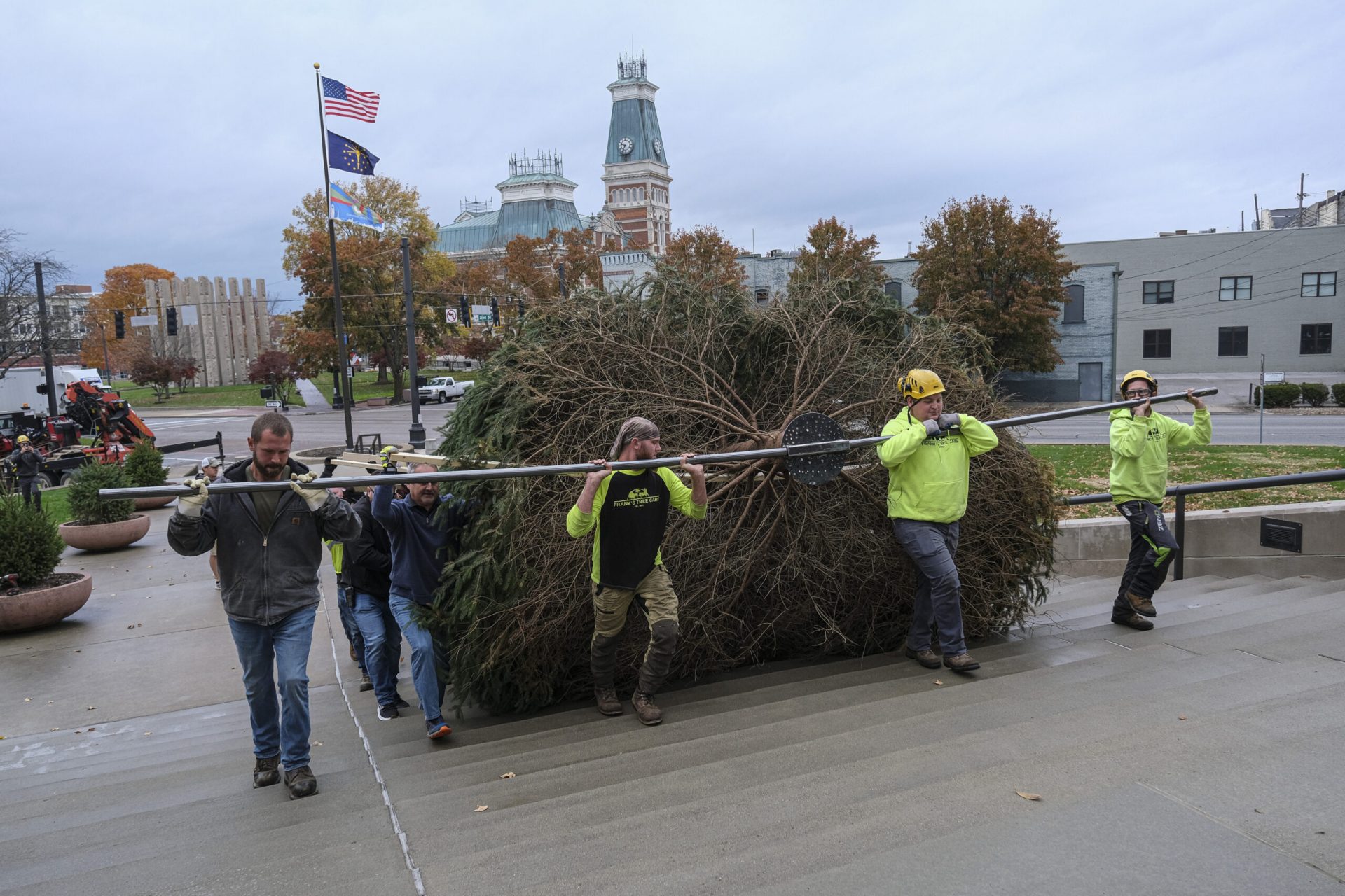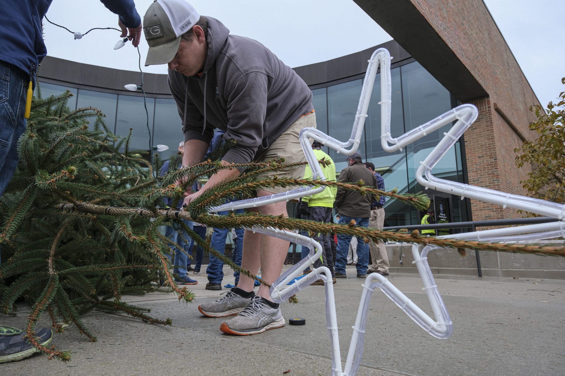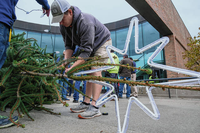Mike Wolanin | The Republic Josh Thompson helps put lights on the Christmas tree at Columbus City Hall in Columbus, Ind., Wednesday, Nov. 17, 2021. Whitney and Patricio Amuchastegui donated the tree.