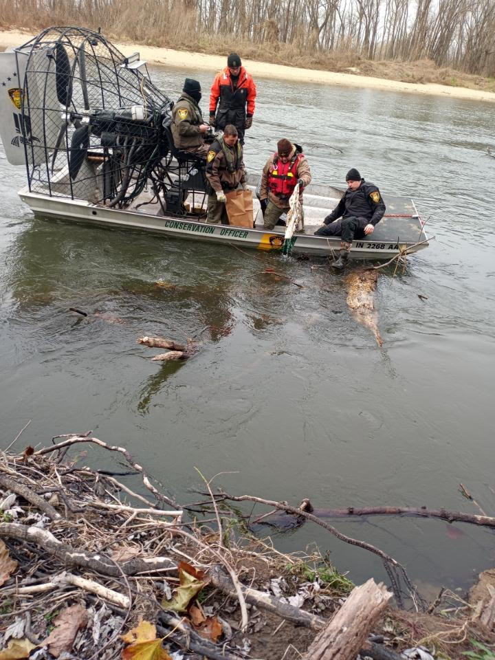 The Bartholomew County Sheriff's airboat is used to pick up the jacket of 2-year-old Emma Sweet near Southern Crossing on the East Fork White River Saturday morning. The jacket was found by three Columbus men searching the riverbank on their own. Photo provided