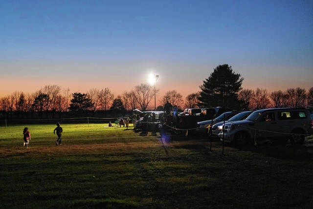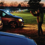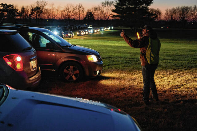 Mike Wolanin | The Republic Nick Neeley guides cars into parking spots before QMIX Christmas Musical Fireworks at Ceraland in Columbus, Ind., Friday, Dec. 3, 2021.